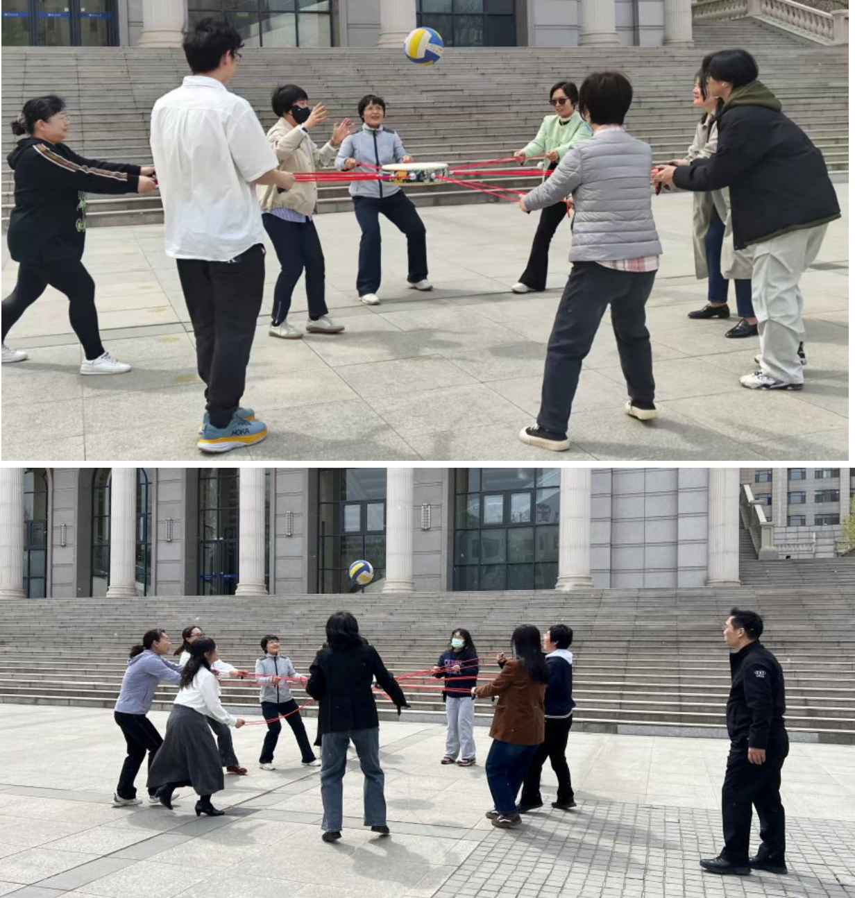 活动伊始,分工会进行了动感颠球的握绳姿势、站位技巧、发力节奏等要点介绍,现场示范多人协作颠球的要领:需要保持鼓面水平、跟随球的落点灵活移动、借助腿部力量带动手臂动作。