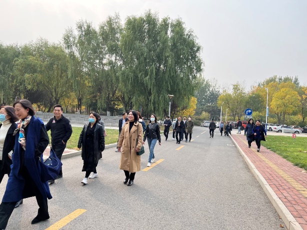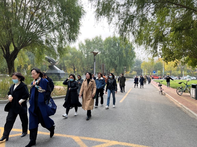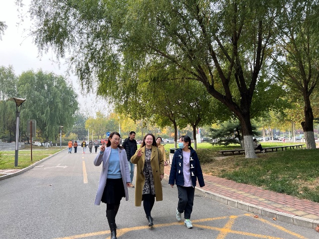 金秋时节,秋风送爽。在一片秋意中,教师们从主C出发了。三两位教师们并排走在一起,谈笑风生。在秋日美景中享受健步走的快意。