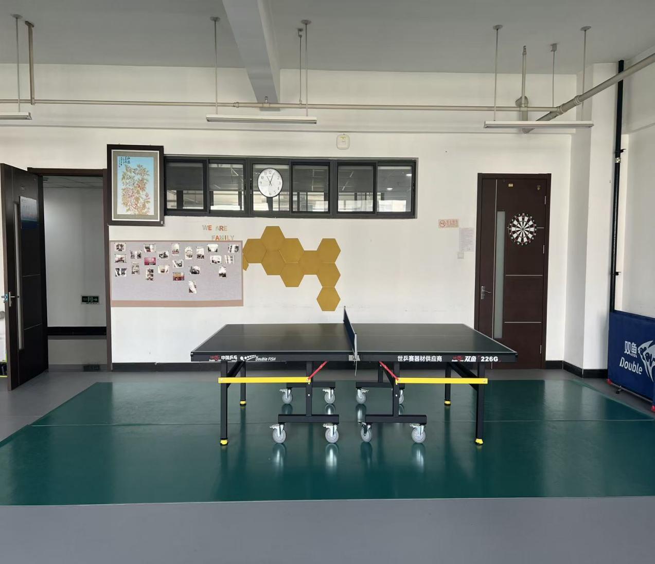 全新亮相的“语嫣“小家功能齐全,环境温馨,充分考虑了教职工的多元化需求,分为阅读区、运动区、休闲娱乐区。倚窗而设的书架陈列着中外文学名著、专业期刊及社科读物;运动区内摆放着乒乓球台、动感单车及壶铃等多种健身器材;休闲娱乐区设有舒适的座椅,热水壶、咖啡机、烤箱等,为教师们提供了课间小憩、学术交流与情感沟通的理想场所。