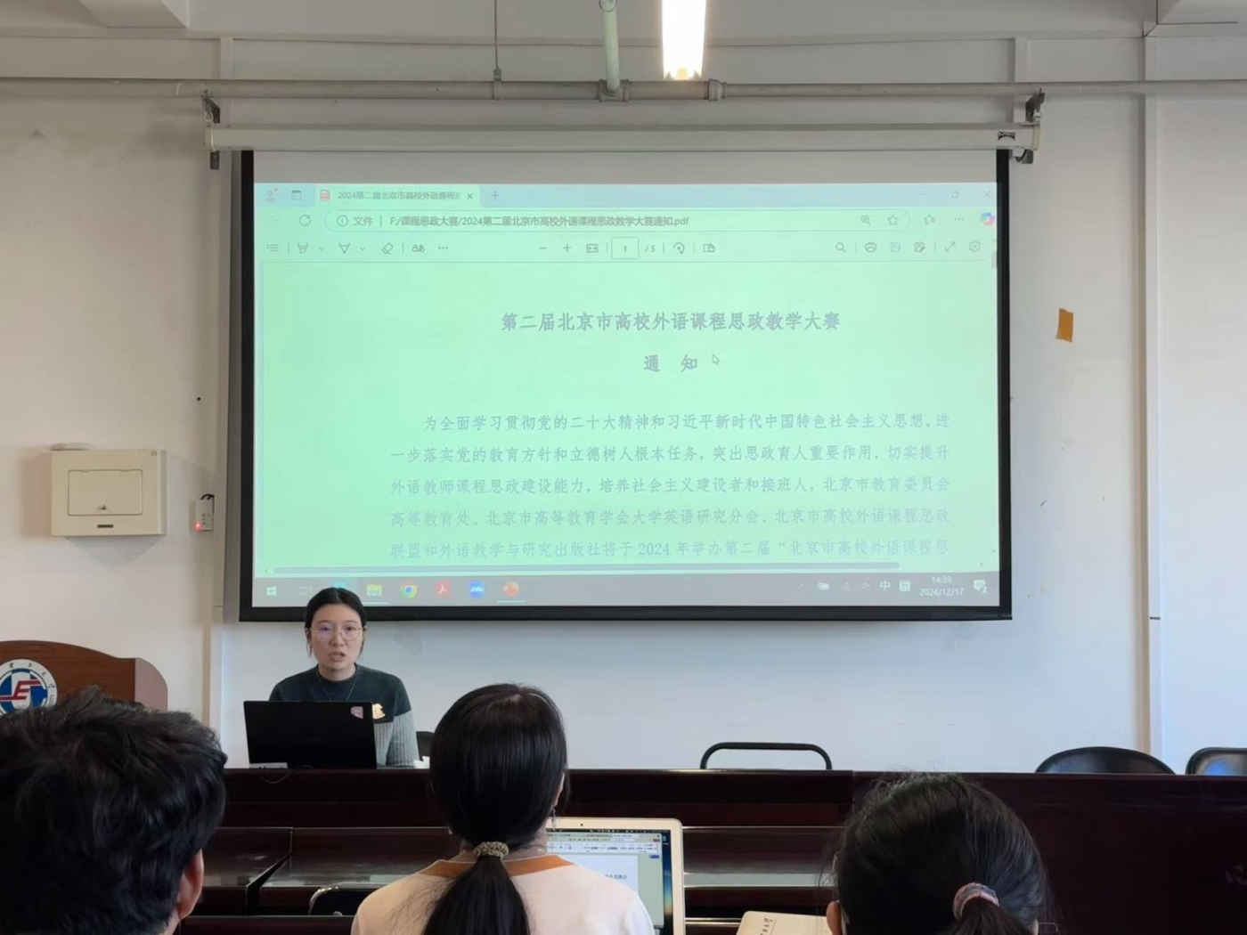 接着,由在北京市高校外语课程思政教学大赛获得特等奖的崔靓老师带来经验总结和交流。崔老师通过此次大赛通知,就比赛时间、比赛内容和赛制进行了全方位的介绍。随后,崔老师通过展示自己的课件重点交流了决赛的经验。她借用中法建交60周年的契机,深入挖掘教材当中的思政内容,讲解了如何在有限的时间内运用视频和游戏等多种教学手段将语言目标和情感目标完整的呈现出来。最后,崔老师就问题设定的难度和ppt制作技巧等方面也做出了说明,并结合自身专业优势,将思政元素融入到教材的讲解当中,使在座教师受益匪浅。