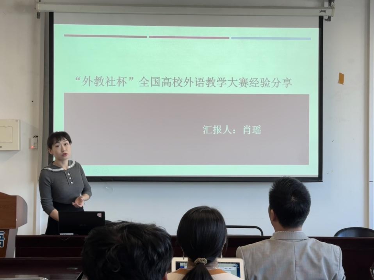 首先,在“外教社杯”全国高校外语教学大赛上获得二等奖的肖瑶老师做经验分享,就大赛内容和经验反思两方面展开了介绍。随后,她分享了自己的备赛经验,她强调课程的准备要内容新颖,贴合社会现实和思政需求,翻译专业的选题并不是纯理论或是技巧,要注意多模态教学手段的运用,夯实教学理论的积累,在教学设计中要体现语言教学和思维能力的培养,把控比赛时间,合理设计每一个教学环节。