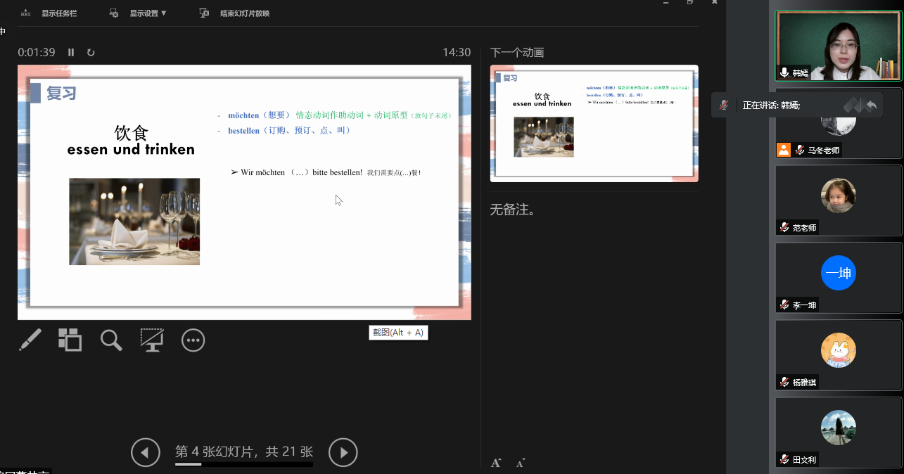 韩嫣老师的授课主要包括讨论中德两国的支付习惯(文化)、 “结账”一词的概念与用法、在餐馆结账的情景对话理解、练习名词的第四格用法、价格(欧元)的表达、探讨“小费”文化、综合听力与对话训练等内容。皇甫伟老师给予教学点评。