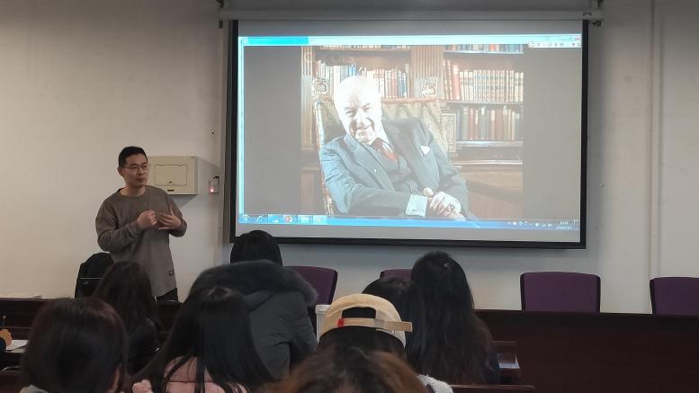 管兴忠教授首先为大家简要介绍了艾克敦的生平事迹及主要的作品。随后管教授从诗歌的翻译、小说的翻译、戏曲的翻译三个方面,详细地阐述了对艾克敦的翻译研究。谈到诗歌翻译,管教授从为什么要有新诗歌讲起,阐明了艾克敦对新诗与旧诗关系的看法,还指出正因为中国的诗歌长期以来深受繁琐的规则束缚,因而艾克敦预见了新诗歌的萌生。为介绍艾克敦对中国新诗的翻译,管教授为大家选取了卞之琳、戴望舒的诗歌进行讲解。随后关于于小说和戏曲的翻译,又选取了艾克敦的代表译作《胶与漆》和《戏剧之精华》,并就中外译者对同一文本的翻译进行了比较分析,这对于大家现阶段或今后的翻译研究有着启发作用。