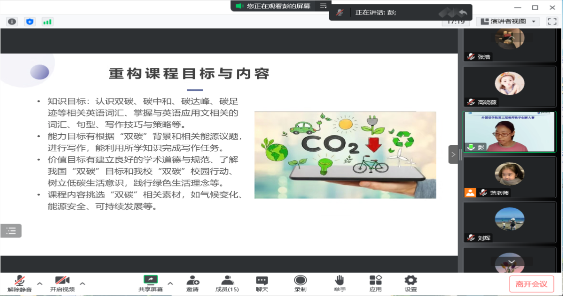 彭霞媚团队将我国“双碳”目标与我校电力能源特色相结合,重构教学内容,与英语应用文的写作结合起来,并提出具有特色的议、摹、练、改、评五步英语写作教学法。问答环节,就评委提出的怎样将“双碳”主题与应用文写作相结合的问题,彭霞媚从呈现给学生的图表的类型、双碳知识等层面予以了回答,力求提高学生英语写作的兴趣和能力,同时加深学生对“双碳”目标的认识。