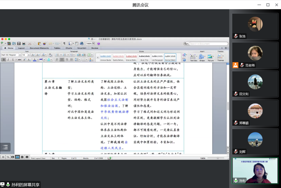 最后进行汇报的是孙利团队,她提出将思政元素融入《法律翻译》的每一章节中,运用多模态翻译教学模式,建设法律翻译思政元素语料库,并采用科学有效、多层级的考核和评价体系,全面提升学生翻译能力和思政水平。