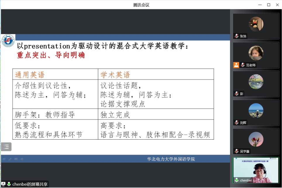 陈蓓团队以教学改革和实践为切入点,借助POA产出导向法,针对通用英语和学术英语教学中出现的问题,提出了以小组合作为前提,先交提纲,再交文稿这一循序渐进式的教学模式。该模式做到了因材施教,尤其针对大一理科学生,以presentation驱动混合式教学,帮助英语基础薄弱的学生提升英语思维能力。