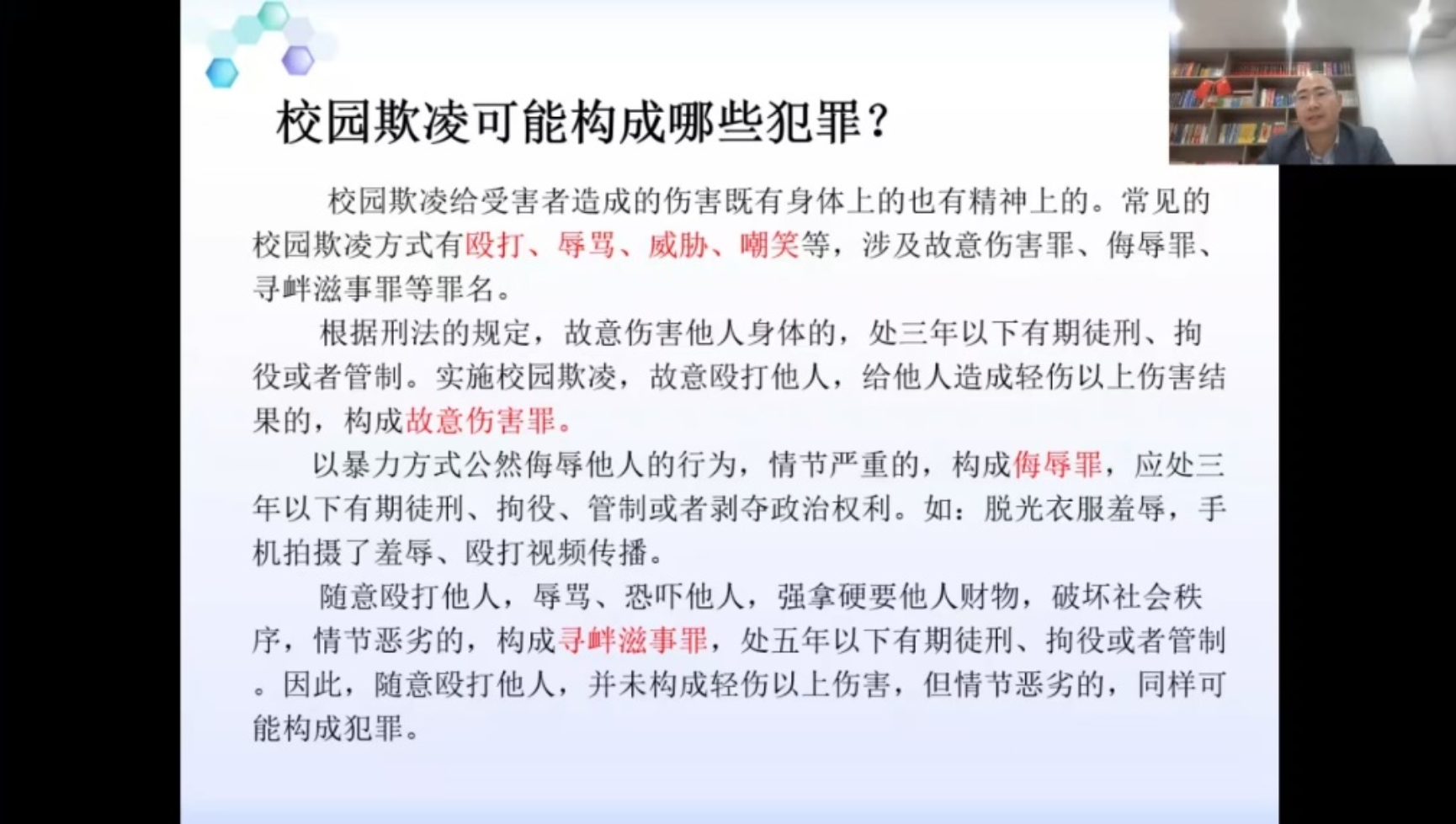 2024年11月17日,华体会(中国)携手北京市海淀区青棠湾社区青年汇,共同开展了以“预防校园欺凌,打造平安校园”为主题的线上普法讲座,华体会(中国)近百名同学参与了本次线上讲座。此次讲座旨在提高学院学生的依法维权意识,增强法律知识。讲座针对校园霸凌相关问题进行了深入剖析,极大地提高了同学们预防校园霸凌的意识,有效拓宽了对校园欺凌处罚条例的认知范畴,进一步保障了身心健康。