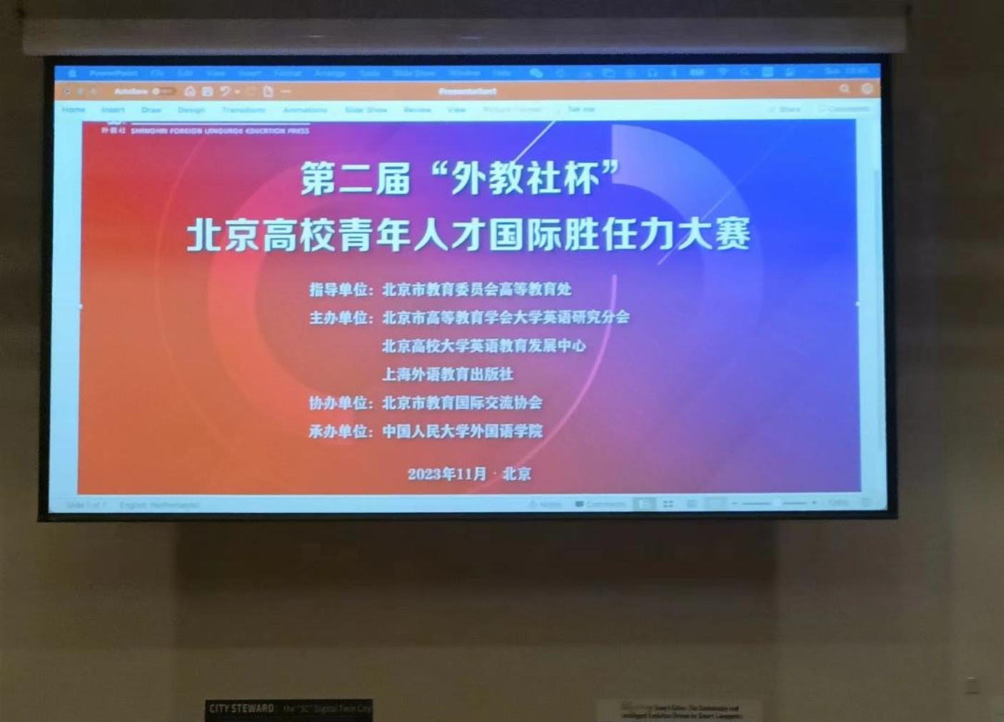 2023年11月5日,第二届“外教社杯”北京高校青年人才国际胜任力大赛决赛在中国人民大学成功举办。本次大赛旨在着力培养熟悉党和国家方针政策、了解我国国情、具有全球视野、通晓国际规则、熟练运用外语、具有国际胜任力、能有效参与全球治理的高水平青年人才。本届大赛以“Technology for a better future”为主题,围绕AI技术在环境保护、生物多样性、智慧养老、健康医疗、城市管理等多个方面的实际作用和最新应用展开,聚焦国内外广泛关注的热门话题。比赛分为校级初赛、市级复赛、现场决赛三个阶段,历时七个月,吸引了首都多所高校学子的积极参与。参赛团队通过撰写提案、设计海报等方式,对具体分议题进行分析并提供解决方案。经过层层选拔,最终来自首都的34个团队进入复赛。经过复赛评审,15所高校的45位选手进入决赛。