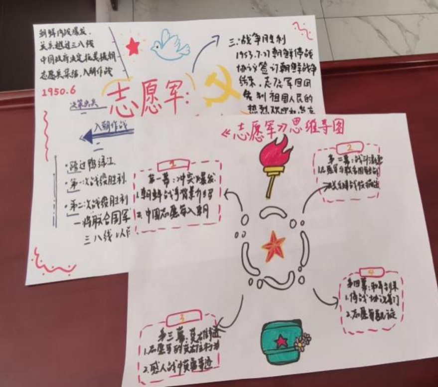 观影结束后,同学们通过绘制思维导图,进一步深化对影片内容和精神内涵的理解与领悟。他们以志愿军的出征历程为主线,详细划分出松骨峰战役、长津湖战役等关键事件,并标注了战役中的战略决策、战斗过程及战士们的英勇行为。此外,同学们还对影片中的爱国主义、英雄主义、革命乐观主义等精神内涵进行了深入的阐释和分析。同学们的发言充满了对革命先烈的敬仰之情,表现出当代青年学子勇于承担社会责任、忠诚报效祖国的坚定意志和强烈愿望。