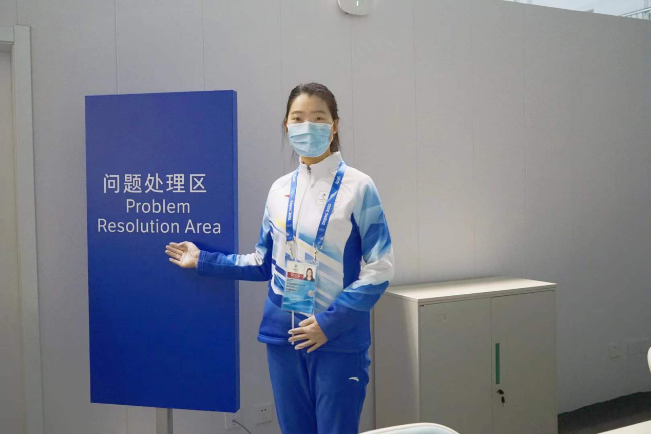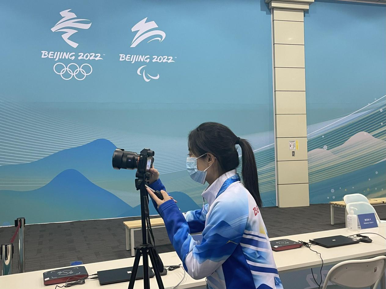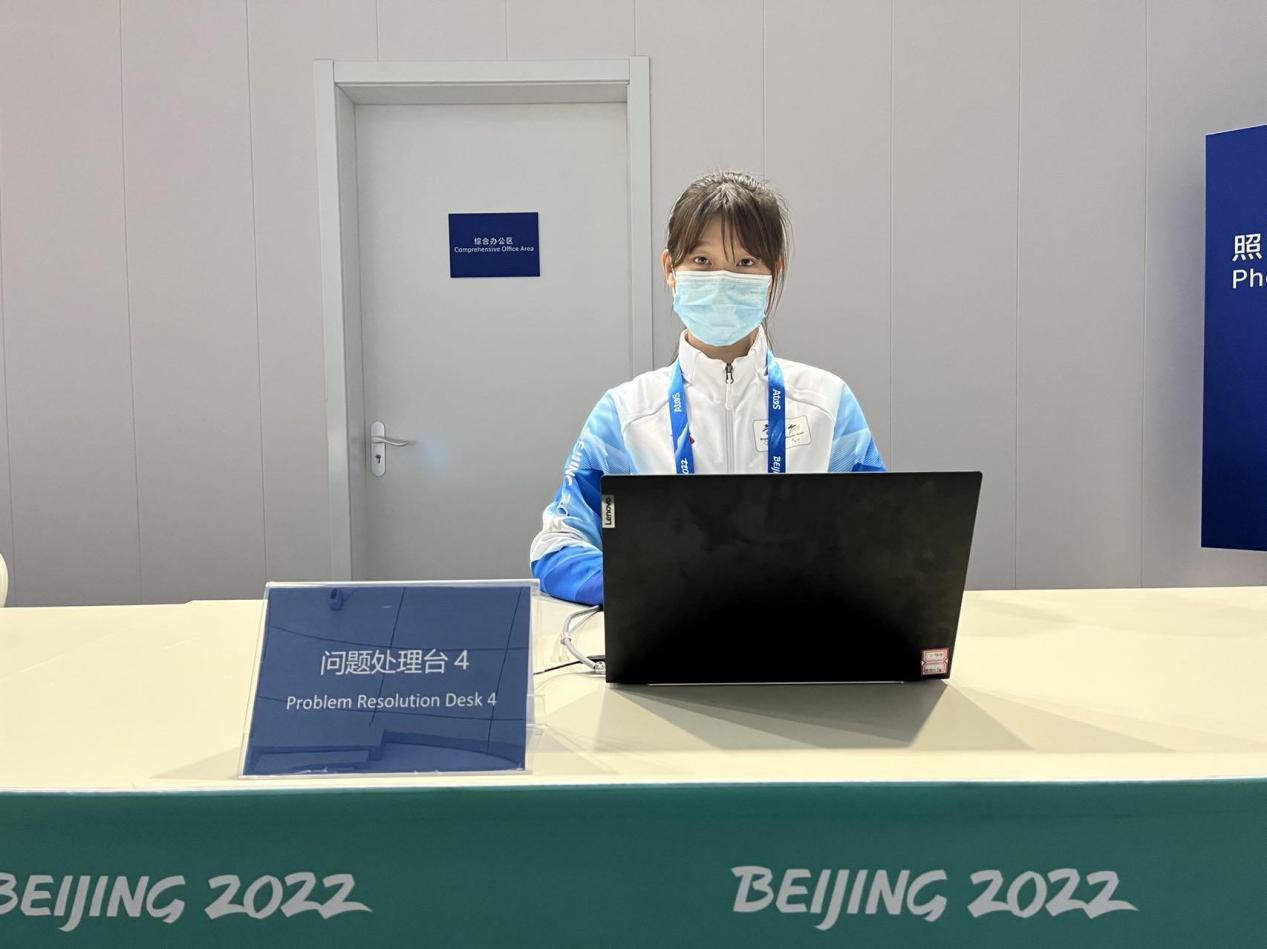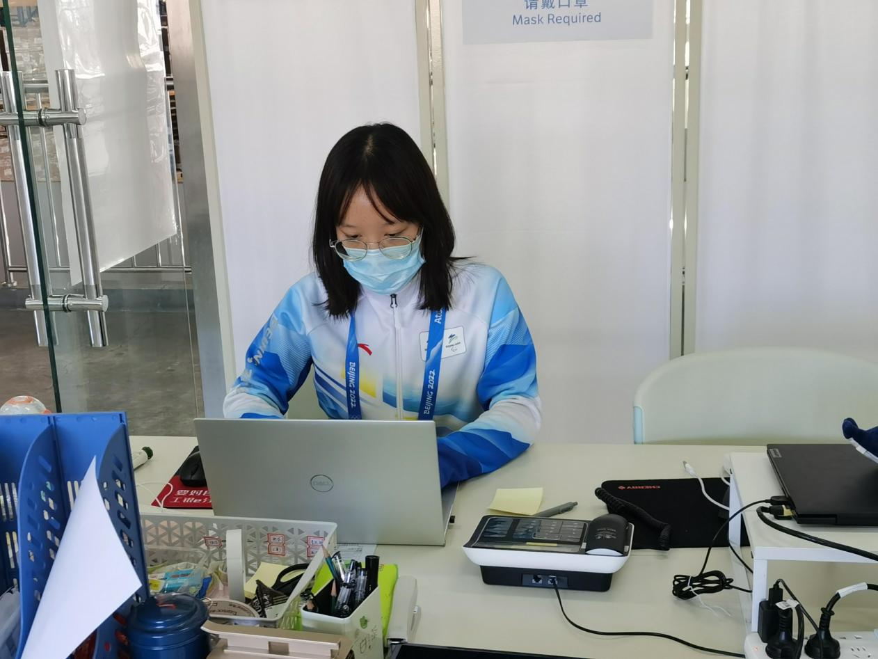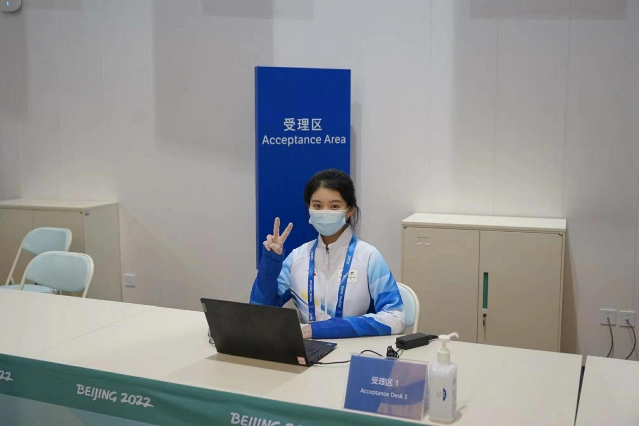 2021年10月8日起,她作为学校第一批冬奥会骨干志愿者,在延庆制服和注册分中心开始志愿服务工作。在YUA场馆进入锁闭期前,进入制证车间接受全流程培训,参与“相约北京”延庆赛区测试赛的证件制作工作,协助运行中心团队处理测试赛通行权限矩阵的数据审核工作。目前担任系统上传组的项目牵头人,主要负责注册证件的系统上传工作、相关资料的英文翻译工作、三个赛区注册设施的信息核对工作等。冬奥和冬残奥赛时,担任客户服务主管,为注册客户提供问题处理和咨询服务。
