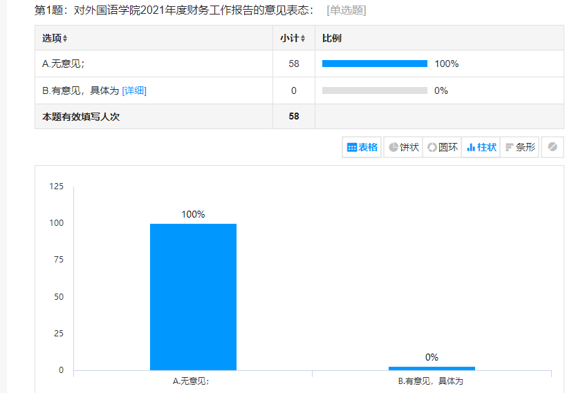 5月19日至31日,华体会(中国)利用问卷星小程序,组织全院教职工审议学院2021年度财务工作报告。截止6月1日,完成投票教职工人数58人,超过了学院教职工总人数的三分之二;对于财务工作报告无意见58人,对于财务工作报告有意见0人。