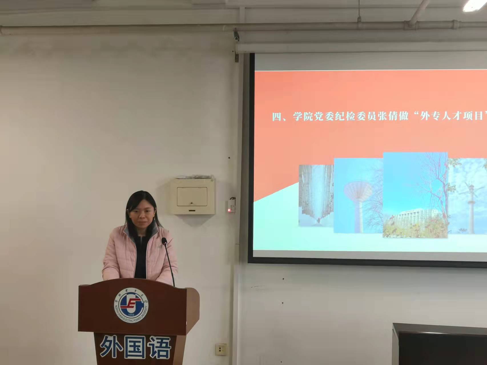 学院党委纪检委员张倩做“外专人才项目”申报介绍,鼓励学院教师再接再厉,争取创造学院科研成绩的新辉煌。