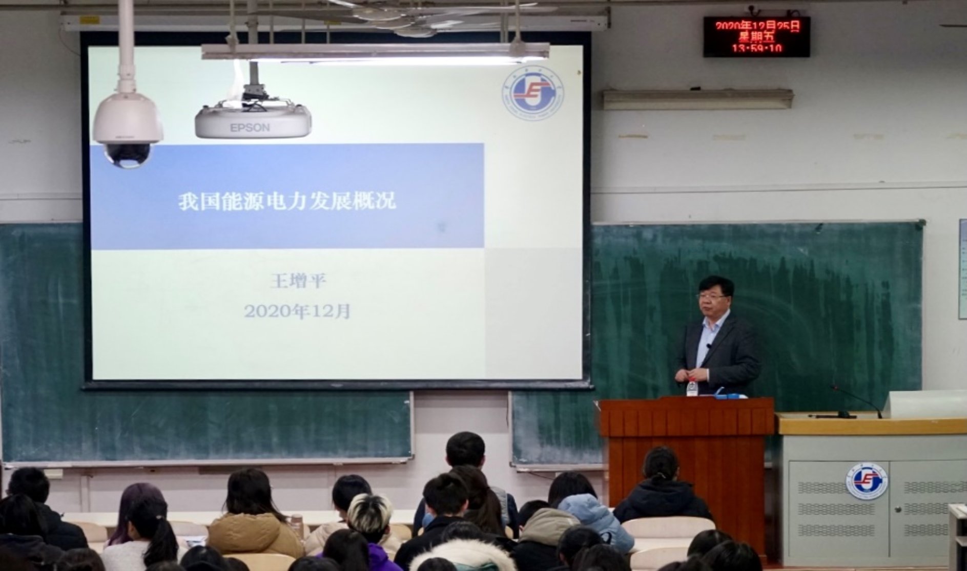 为全面贯彻落实学校《关于开展党的十九届五中全会精神学习宣传主题活动》的通知精神以及学校《关于加强和改进思想政治理论课建设的实施方案》等相关工作部署,深入学习宣传党的十九届五中全会精神,同时使广大师生更全面了解我国电力工业发展的新成果、新理念,进一步加深对新形势下我国电力工业发展的新认识,12月25日,副校长王增平为我院全体二年级学生及部分教师代表讲授了以“我国能源电力发展概况”为主题的专题思政课。