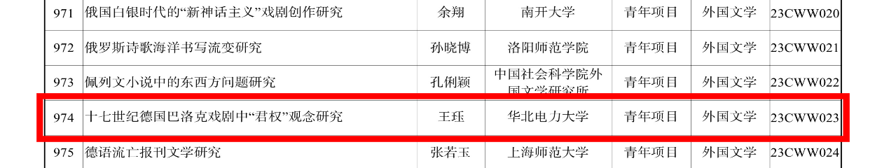 获得立项的分别是我院尹宇老师和王珏老师。其中,尹宇老师的《为他者存在:威廉·沃尔曼后现代伦理思想研究》获后期资助项目立项;王珏老师的《十七世纪德国巴洛克戏剧中“君权”观念研究》获青年项目立项。