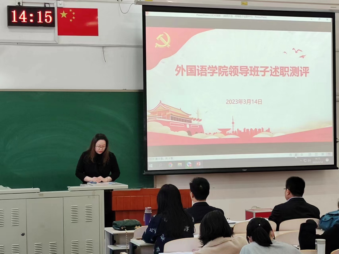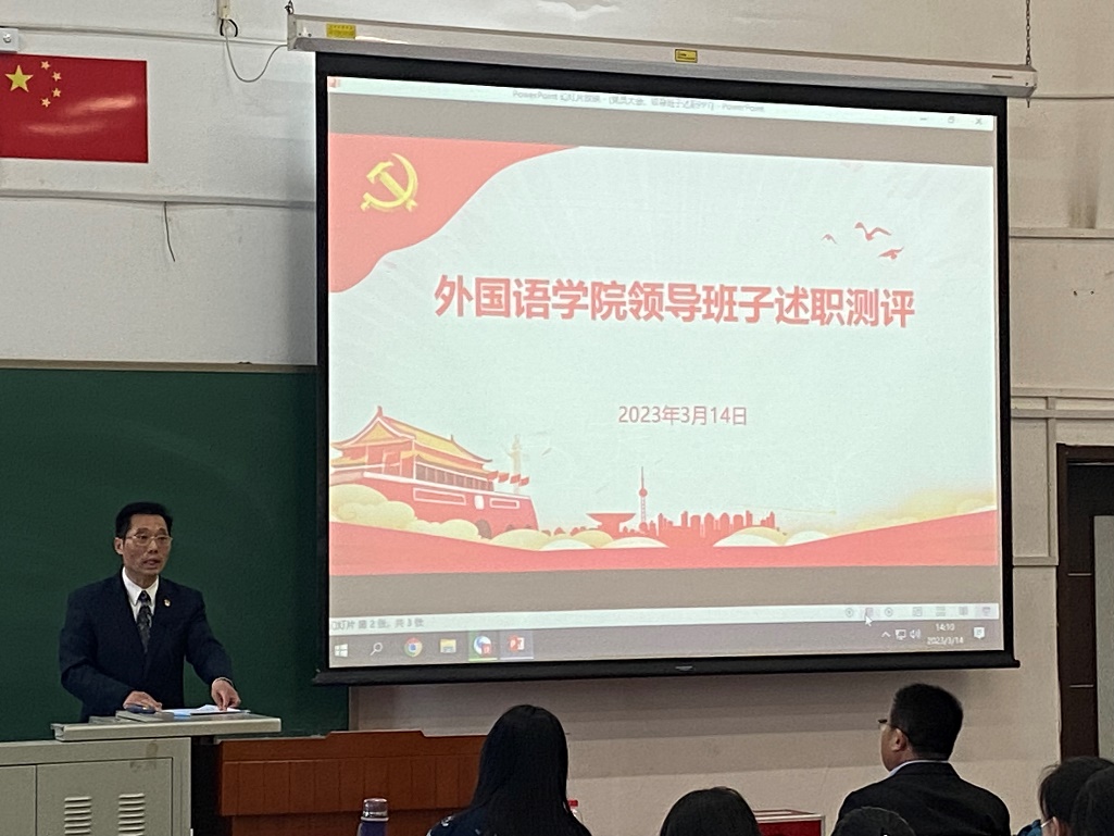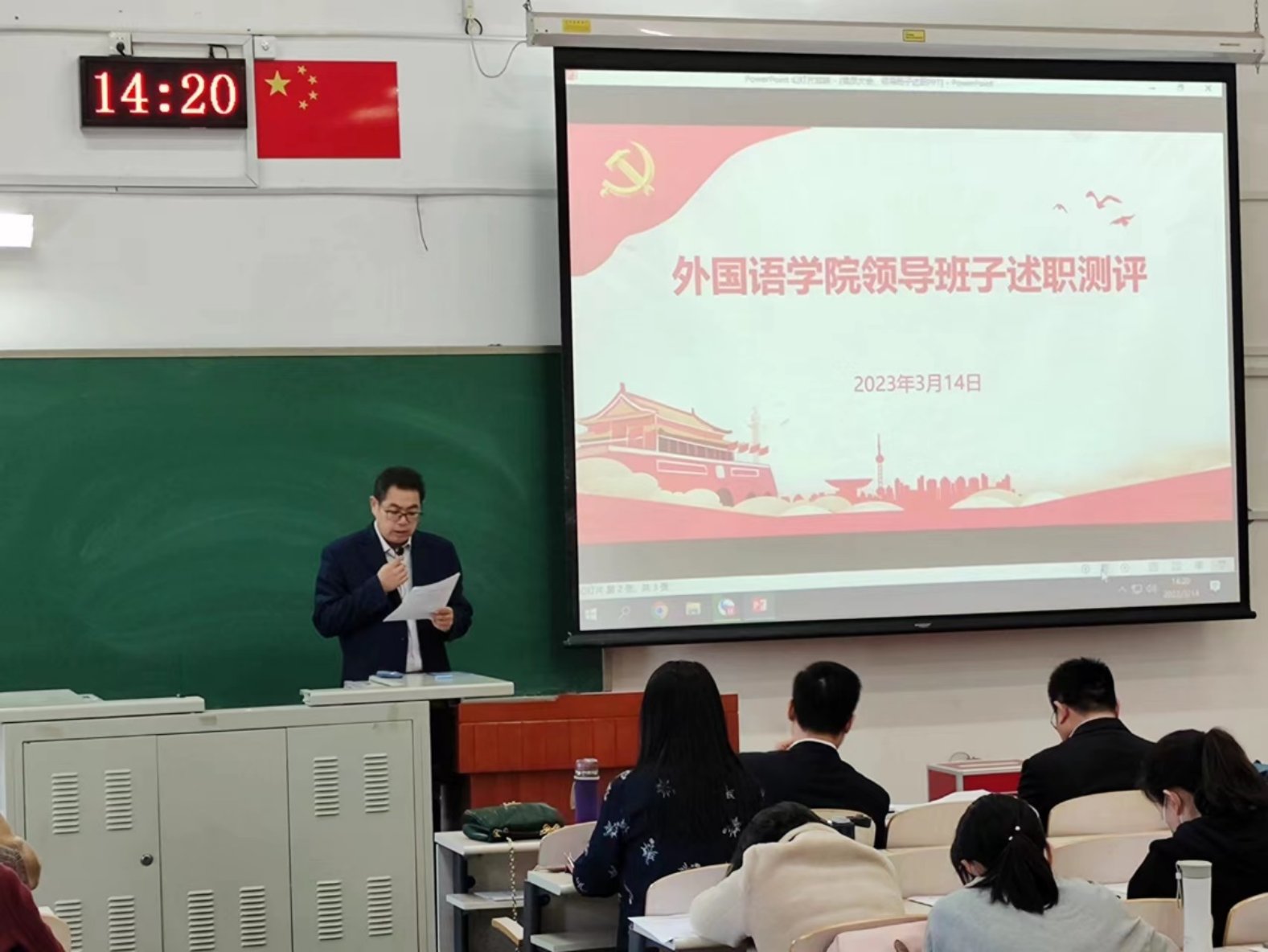 然后,学院党委书记于喜海、副院长刘辉、副书记马冬分别结合个人分管工作进行了工作述职。2022年学院各项工作虽然受到新冠疫情严重冲击,师生身体健康和正常学习、工作秩序经受了严重考验,但在学院党委的领导下,全体师生精诚团结、共克时艰,在学院党建组织、防疫服务、师德师风、迎巡整改、党风廉政、教育教学、科学研究、思政教育、学生管理、工会工作等方面依然取得了整体进步和持续发展。总结经验,面向未来,在学校党委领导下,学院党委将扎实推动党史学习教育常态化,认真学习习近平总书记在在中国共产党第二十次全国代表大会上的讲话精神,以学习贯彻党的二十大、二十届一中、二中全会精神为主线,认真落实周坚书记在“学习宣传贯彻党的二十大精神推动习近平新时代中国特色社会主义思想‘三进’”工作推进会上的工作安排,团结带领全院师生扎实推进学院“十四五”规划落地、落实,努力实现党建与事业齐抓共管、比翼齐飞,以务实举措及扎实作风投身学院各项工作,为学校事业高质量发展贡献力量。