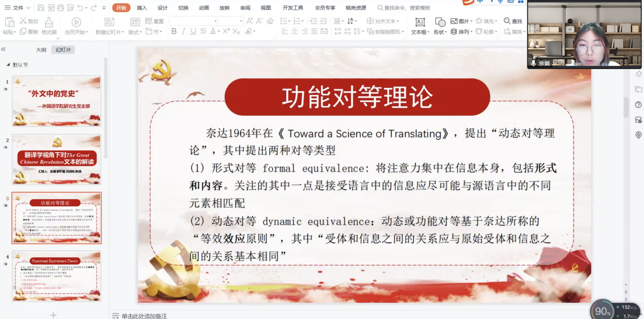 接着,研究生党支部的四位学生党员代表对本书的文本分别从翻译实践、翻译学、语言学和文学三个方面进行了深入而系统的学术阐释。