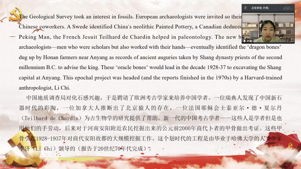 四位党员代表完成相关专业讲解之后,学院党委保卫委员尹宇进行专业点评,她对同学们不同专业视角下的文本解读表示了肯定,同时也希望同学们能够发现外文文本与自己本专业更深层次的关系。并希望学院党委“外文中的党史”主题党日活动能够继续挖掘外文文献在党史学习中的意义,彰显学院党建的特色和活力。