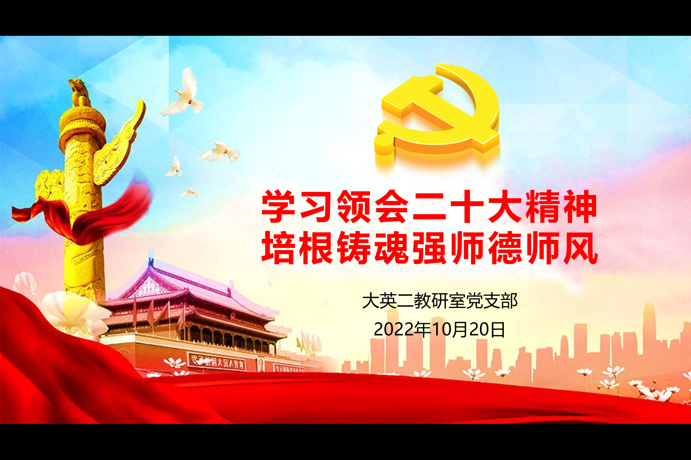 为学习领会党的二十大精神,全面贯彻党的教育大计,进一步加强教师队伍师德师风建设,落实立德树人根本任务,提升教师的职业道德修养,2022年10月20日中午,大英二教研室党支部协同本教研室以腾讯会议方式举行了“学习领会党的二十大精神,培根铸魂强师德师风”集体学习及讨论交流大会。会议由支部书记王欣老师主持,学院院长康建刚及教研室全体教师参加了本次会议。